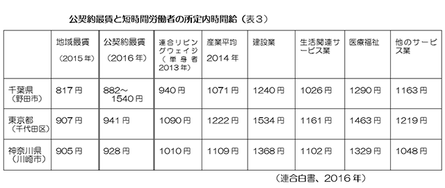 さらに、単身者の場合であっても、連合のリビングウェイジ(単身者)にも達していない。(表3)産業別にみた場合も連合の産業別短時間労働者の時間給表(表3)と比較しても、これまでの公契約条例最低賃金の低さが目立つ。