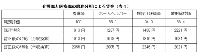 問題は、その水準をどこに設定するかである。現行介護相場賃金では問題にならない。なぜなら現行介護相場賃金の安さが問題になっているからだ。介護労働安定センター調査に基づく賃金は国が介護保険成立後導いてきた結果としての低賃金であり、問題解決にはならない。ここで「同一価値労働・同一賃金」の原則と手法を活かすことができる。これまでにも、自治労都本部が「同一価値労働・同一賃金」原則により医療職と職務分析調査(注2)をしている。その結果が以下(表4)である。
