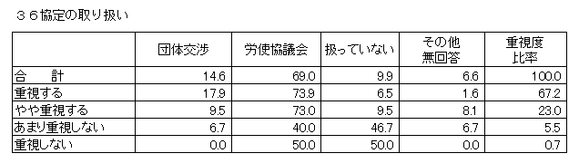 また、この調査では、労使間で取り上げている36のテーマについて、それぞれの取組みの度合いを「重視する」か「重視しない」か、5段階で評価させている。これとパート・アルバイト・契約社員等の労働条件の協約上の取り扱いとクロス集計した結果が別表の通りである。