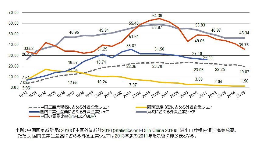 だが、注目したいのは、今世紀に入って生まれている中国、そして東アジア経済の質的変化である。とりわけ中国では「二重の自立化」といえる現象が起こっている。中国が日本を超えて世界第2位の経済大国に躍り出たのは2010年(統計的には2009年)であるが、2000年代に入ると、経済は対外依存度と外資依存度で共に低下が始まった。図4は中国の貿易比率(輸出+輸入/GDP)と外資系諸指標を1992~2015年についてみたものである。