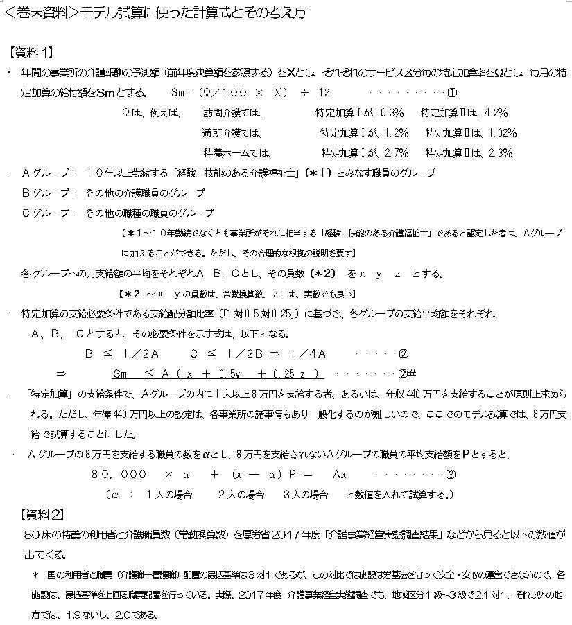 なお、画面イメージで表示した巻末の【資料1】と【資料2】に、その数値と計算式等を示したので、この計算式に各事業所の実際の数値を当てはめて自分の職場の「特定加算」の配分を検討されたい。
