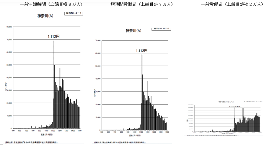 本誌では繰り返しになるが、上図上段は2006年の、下段は今年の、神奈川県に関する中央最低賃金審議会の賃金分布資料である。2006年はすでに述べたように、パートタイマーが増えたことが明確にされていた時期だが、それでも最近に比べると、低賃金労働者の分布中心は最低賃金から少しは離れている。