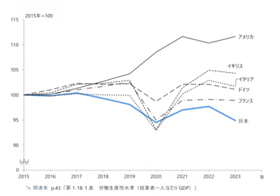 実際には、日本の一人当たり生産性については、日本生産性本部などの資料によっても、「2024年の日本の一人当たり労働生産性(就業者一人当たり付加価値)は、 98,344ドル(935万円/購買力平価(PPP)換算)。順位は、OECD加盟38カ国中29位。主要先進7カ国でみると最も低い状況が続いている」とされている。「日本の一人当たり労働生産性は、米国の54 %程度で、主要先進7カ国の中では日本に次いで労働生産性が低い英国と比べても8割弱」となっているのだ。台湾、香港には大きく遅れ、韓国にも及ばない。その推移を見ても、最近は特に落ち込んでいる(先の折れ線グラフ、アークタイムズによる)。日本はともかく力もなく、貧しくなっているのである。そこから出発せざるを得ないのだ。
