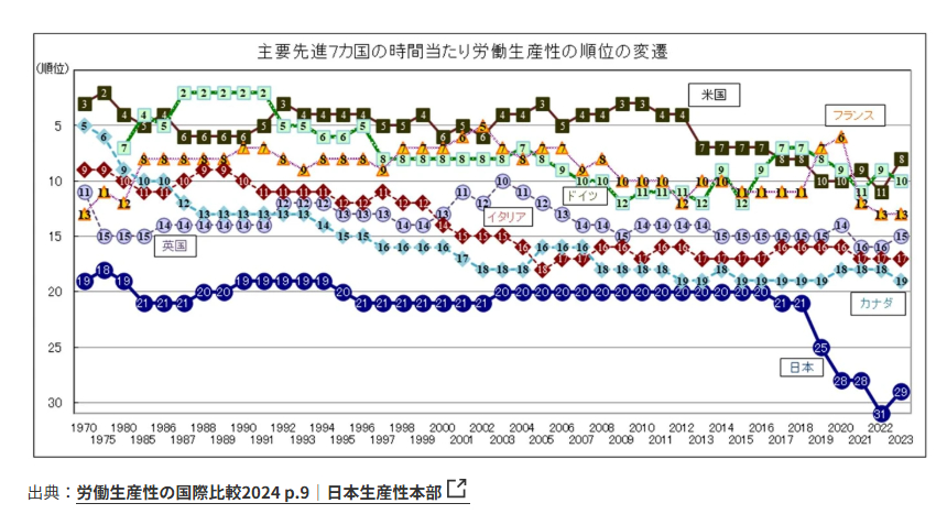 実際には、日本の一人当たり生産性については、日本生産性本部などの資料によっても、「2024年の日本の一人当たり労働生産性(就業者一人当たり付加価値)は、 98,344ドル(935万円/購買力平価(PPP)換算)。順位は、OECD加盟38カ国中29位。主要先進7カ国でみると最も低い状況が続いている」とされている。「日本の一人当たり労働生産性は、米国の54 %程度で、主要先進7カ国の中では日本に次いで労働生産性が低い英国と比べても8割弱」となっているのだ。台湾、香港には大きく遅れ、韓国にも及ばない。その推移を見ても、最近は特に落ち込んでいる(先の折れ線グラフ、アークタイムズによる)。日本はともかく力もなく、貧しくなっているのである。そこから出発せざるを得ないのだ。