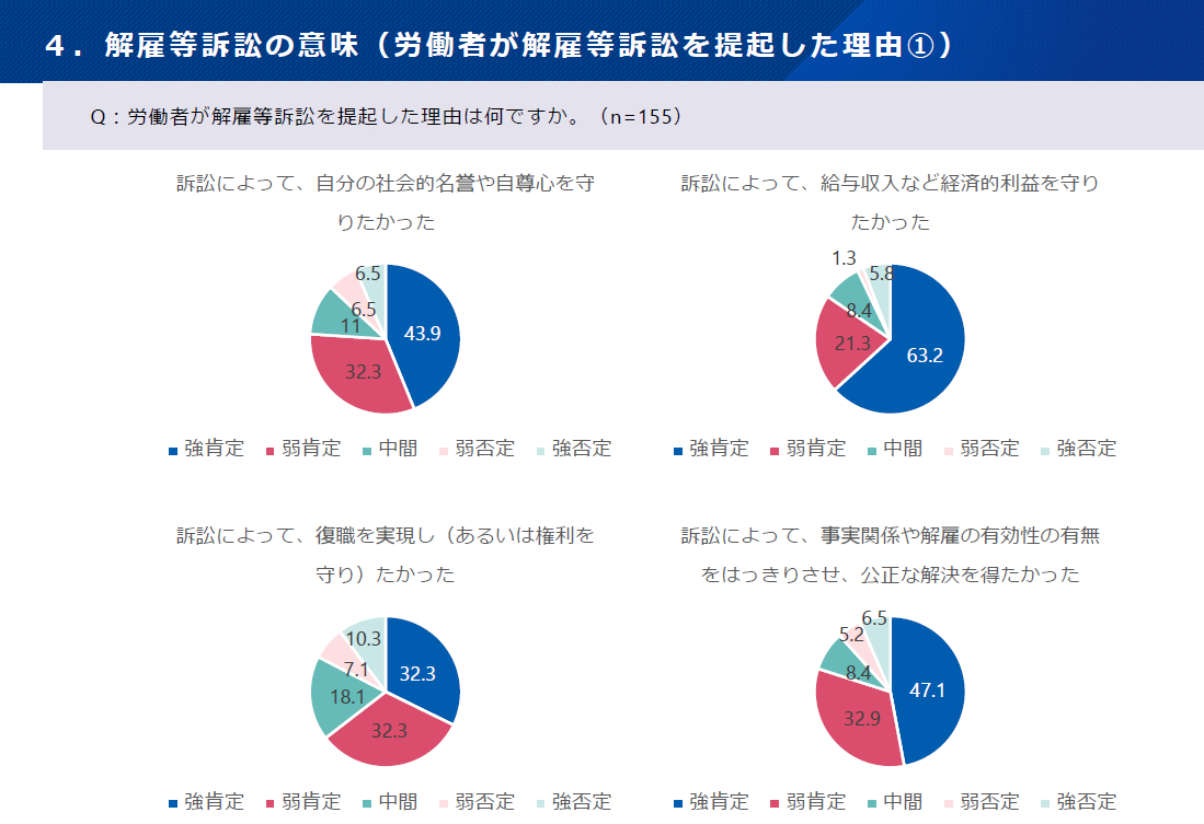 分科会では金銭を受け取ることで契約を終了させたいというニーズがあると発言があったが、それは経営者が職場復帰に協力しないからであり、決して多くの労働者が求めているわけではない。下記に示す厚労省の規制改革会議に対する調査結果(2024年5月、訴訟を担当した弁護士らへの調査)にみられる通り、名誉、賃金、職場復帰を目指して提訴する労働者が圧倒的多数であることからも明らかである。